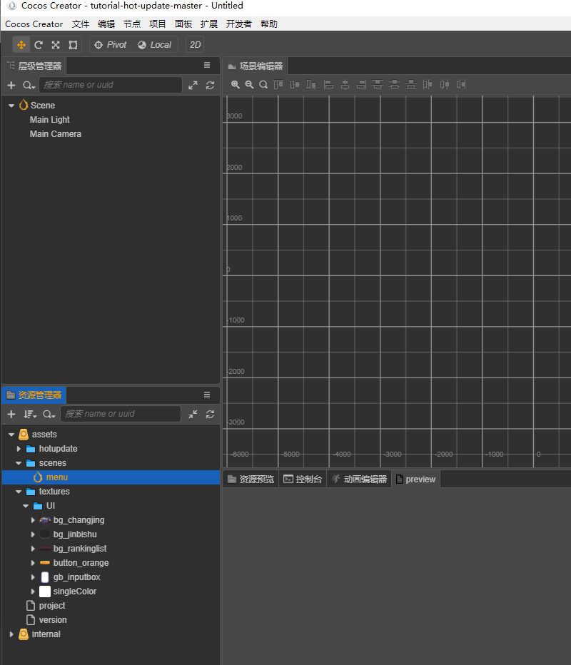可是用creator 3.0 preview打开后场景后界面什么也没有,这是怎么回事呀,有大神能给个完整版的范例吗?急需学习热更新呀