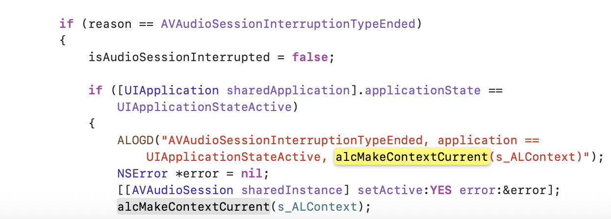 D/AudioEngine-inl.mm (186): UIApplicationDidBecomeActiveNotification, alcMakeContextCurrent(s_ALContext) -