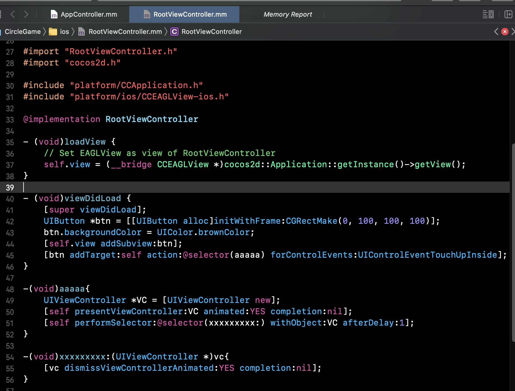1、用creator生成iOS项目,在rootViewController里面添加截图中的代码。