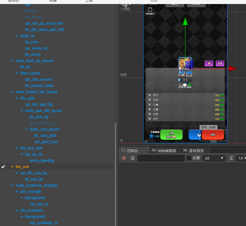 这个预制件,我刚开始就是看节点太多,所以那6个属性条,我是根据需求动态加载相应属性条,但是在安卓手机上会出现6个属性条依次从上到下挨个出现的表现,策划不能接受这种表现,所以后来又改成直接全部挂载在预制件中了。 另外你说的,“除预制体第一个界面展示的UI之外,全部都动态加载,就能解决你的问题”, 其实这个预制件首次要展示的就是这样,除了下面红色按钮和node_uplv_info这个节点不需要首次展示,其他都需要。
