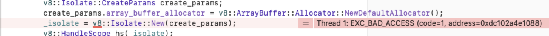 frame #19: 0x00000001006b7c24 NewProject_2-mobile`v8::internal::Builtin_Impl_HandleApiCall(v8::internal::BuiltinArguments, v8::internal::Isolate*) + 276