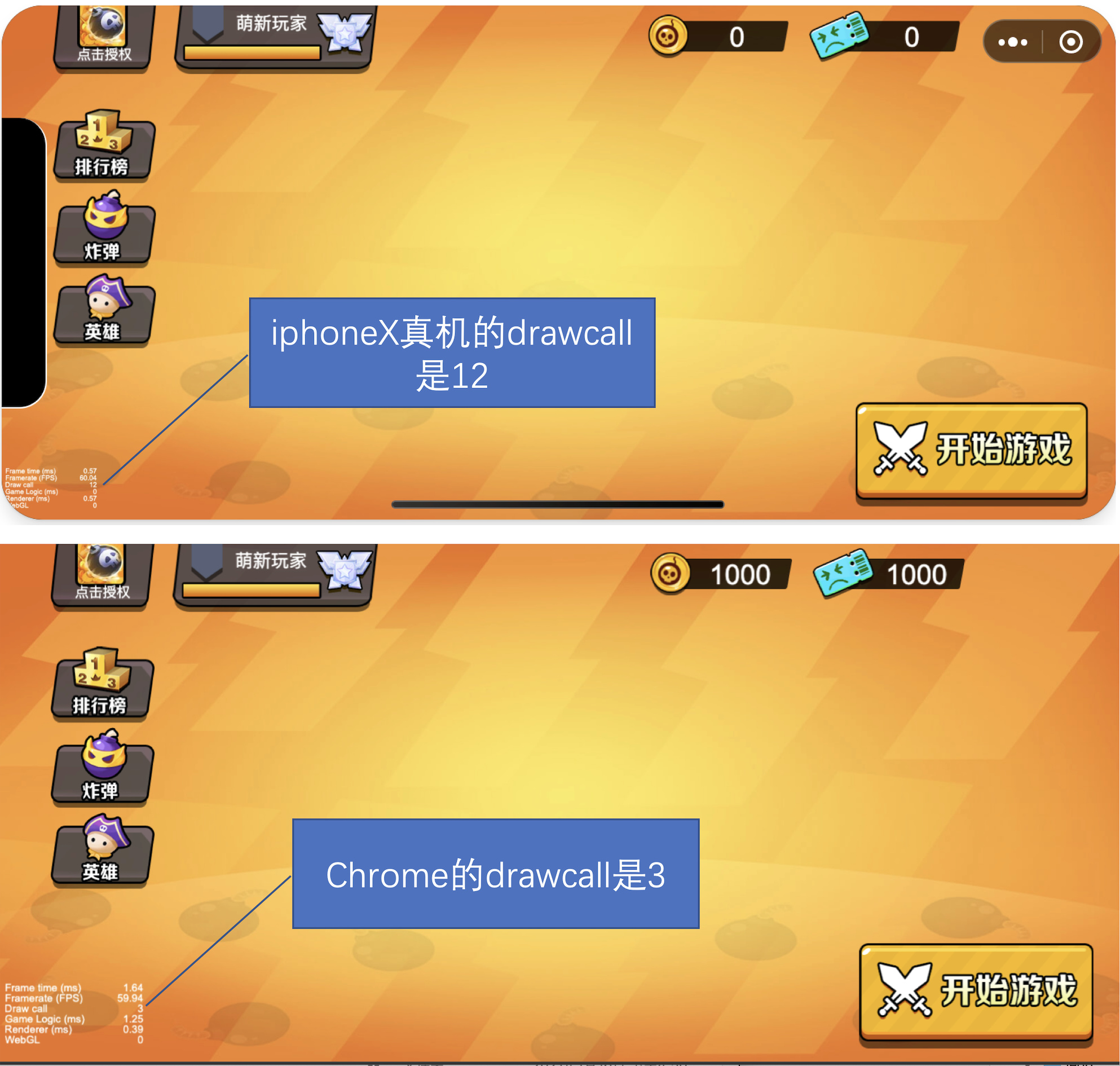 渲染完全相同的页面,浏览器的drawcall只有3,而真机上有12。已经使用AutoAtlas把所有碎图都打包了。