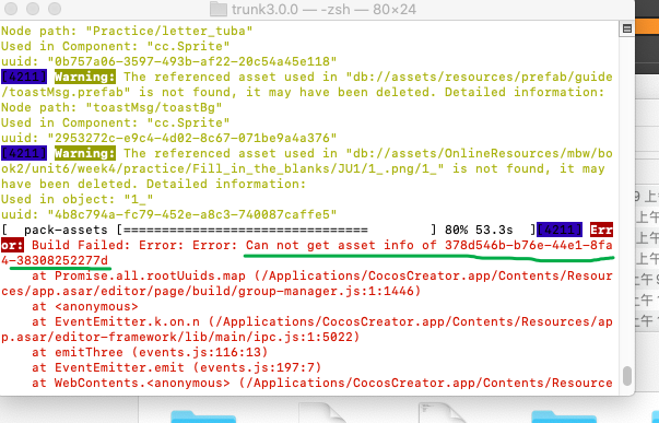 首个报错: 构建到80%左右 Error: Build Failed: Error: Error: Can not get asset info of xxxxx 某个资源的uuid号,