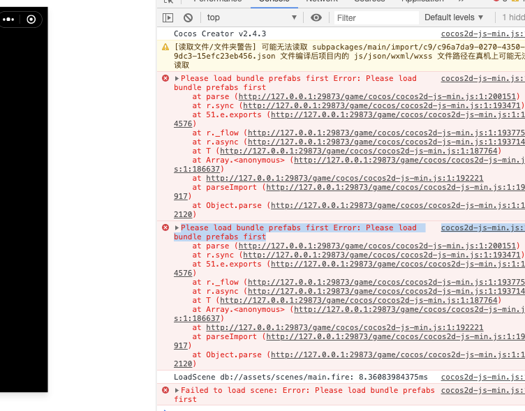 首个报错:cocos2d-js-min.js:1 Please load bundle prefabs first Error: Please load bundle prefabs first