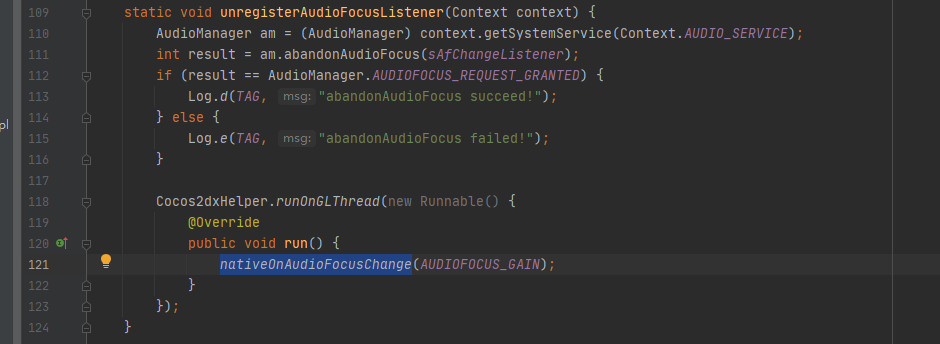 nativeOnAudioFocusChange(AUDIOFOCUS_GAIN); // <----------------------【出错代码行】----------------