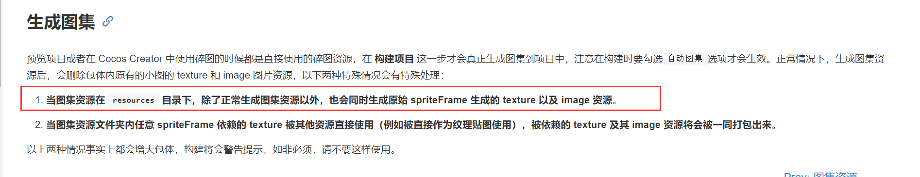 如果这个资源没有在脚本被动态加载的必要,建议不要放在 bundle 内,直接放在外面,和之前 resources 使用方式一样,bundle 内如果有资源依赖了图集小图资源,查找依赖关系后自然会将这个图集大图打包进去的。