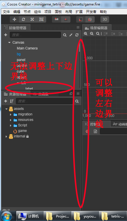 非常抱歉,本人是cocos creator小白,今天开始做第一个练习项目。我发现编辑器左边(上面)的层级管理器和左边(下面)的资源管理器的大小无法调整啊。现在,层级管理器的高度是屏幕高度的三分之一左右,资源管理器的高度是屏幕高度的三分之二左右。