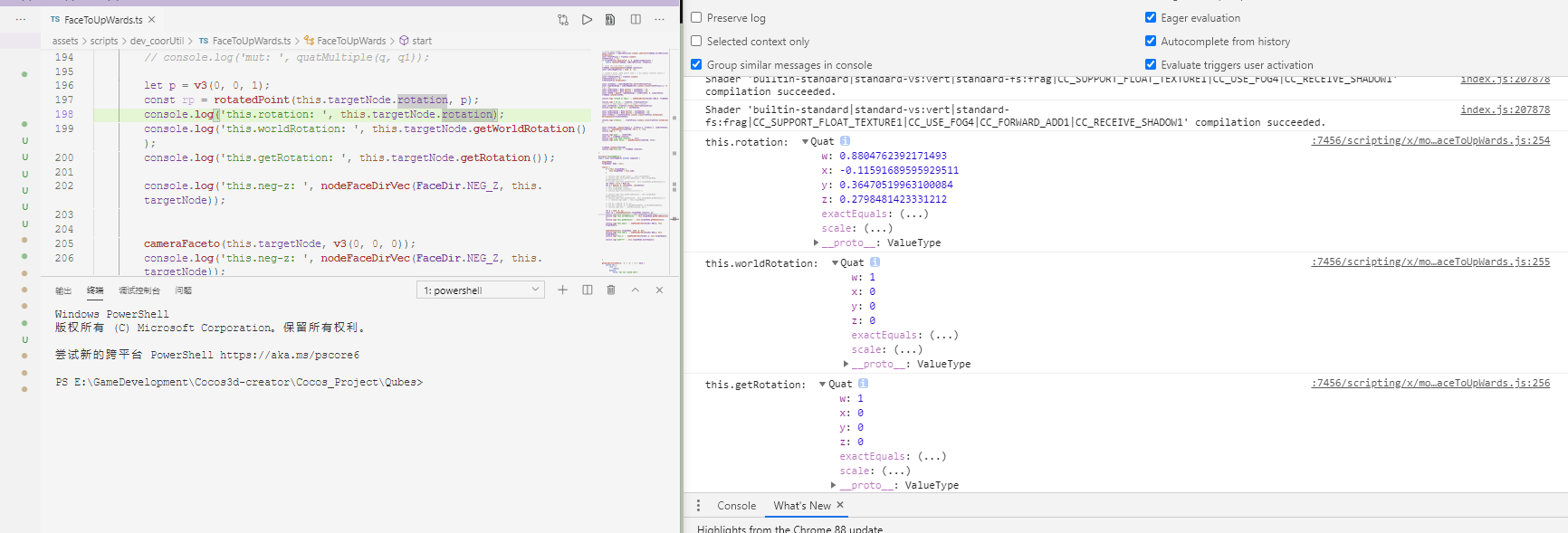 话不多说上图,按文档的意思rotation属性和getRotation应该返回同样的值,getRotation的存在应该是为了复用Quat对象,但是我取值出来不一样,我今天还遇到一个神奇的bug,还没有解决,具体比较复杂,大概是node的rotate方法的问题,空了贴上来