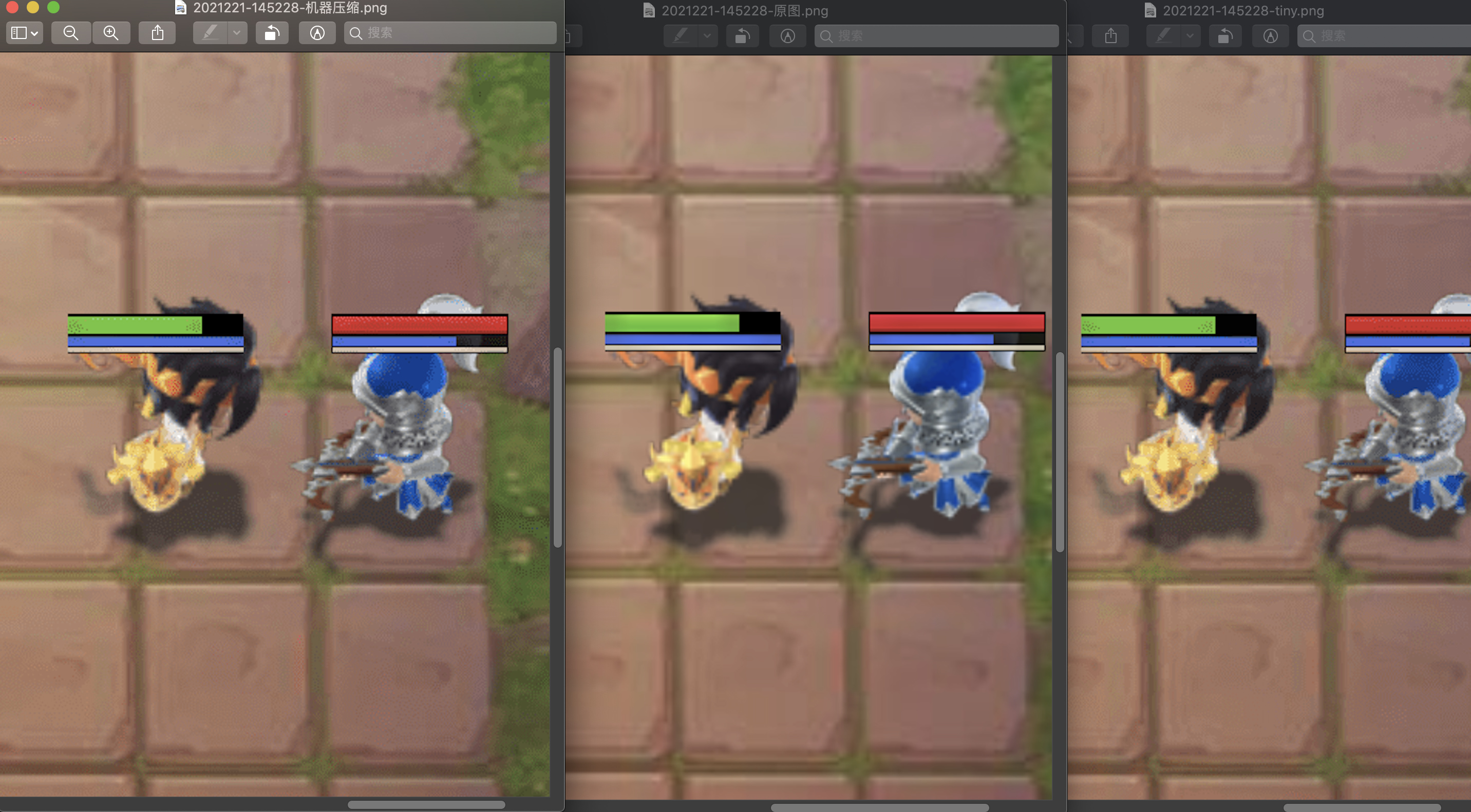下面测试从左到右的效果分别是【楼主软件-800KB】->【原图-1.4MB】->【TinyPNG-650KB】