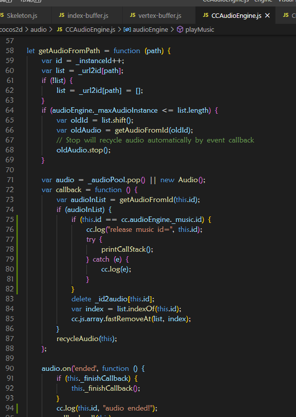 - 因为_id2audio中已经删除了第二个音乐,但是cc.audioEngine中的_music.id仍然持有改音乐的播放ID.这时候stopMusic已经无效