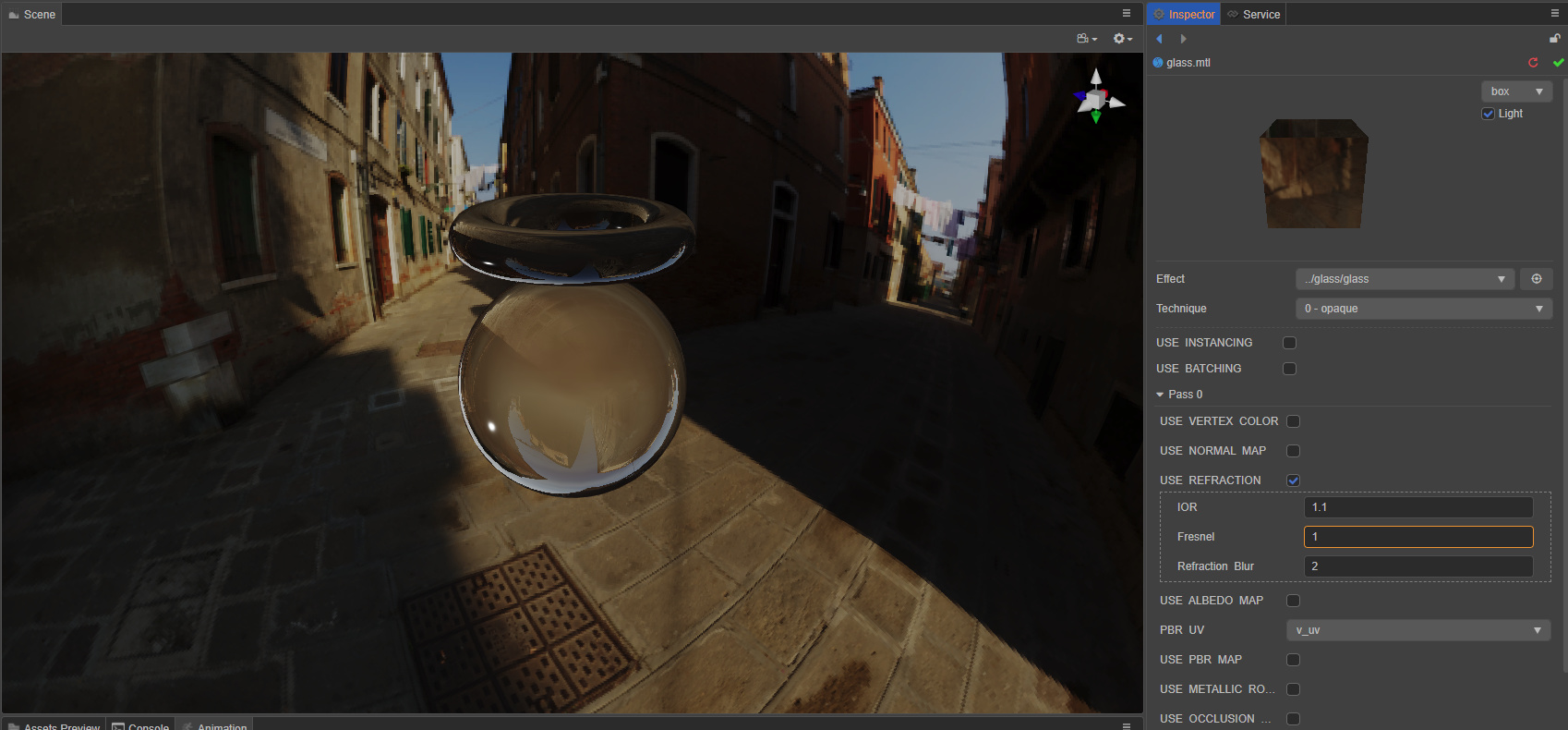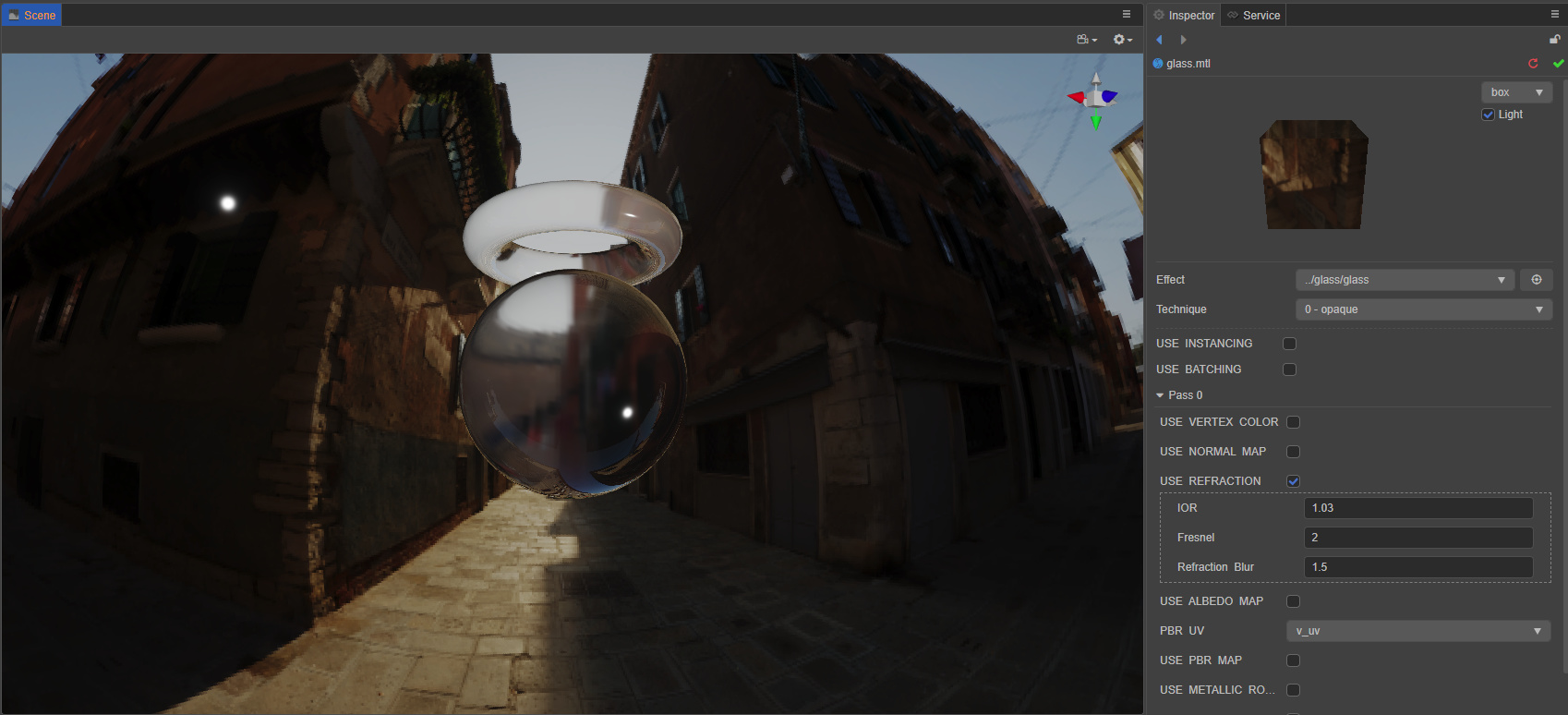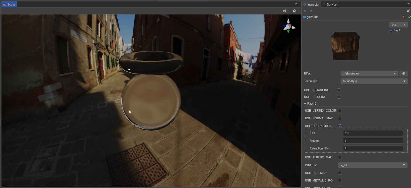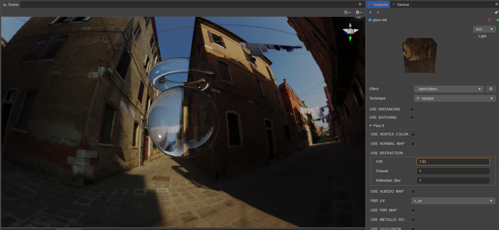 主要就是glsl reflect和refract函数得到采样方向的向量,然后对IBL的cubemap采样得到反射和折射图像,最后用菲涅尔系数对反射和折射进行混合。