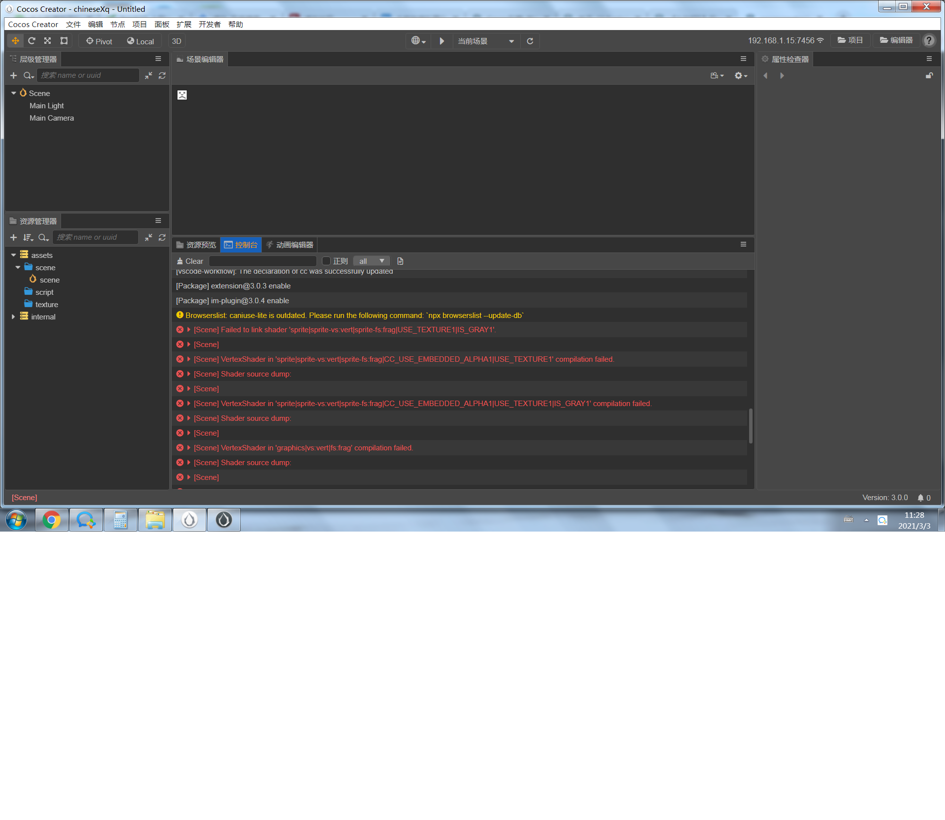 win7系统cocosCreator3.0编辑器报错,编辑器里面什么也看不到,在浏览器预览没有问题
