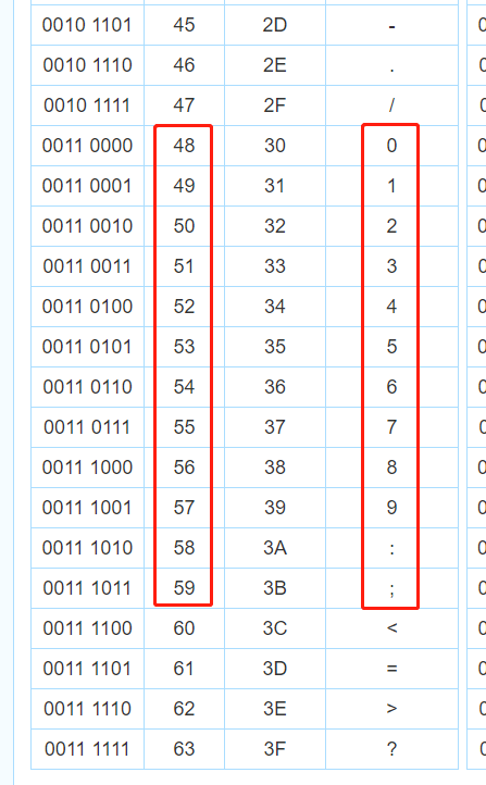先了解一下ASCII码,如果设置第一个字符为ASCII码的48号。那对应的就是0;