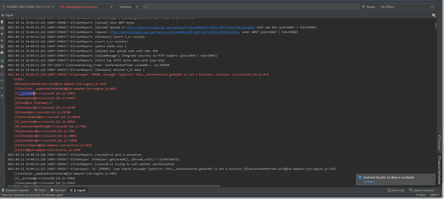 重现方式:有LoadingScene和TestScene来回切换. LoadingScene中调用接口 cc.director.preloadScene(“TestScene”) TestScene中有若干个spine资源放在场景中. TestScene是自动释放资源的.多次切换场景后偶现闪屏现象.logcat上有报错堆栈: