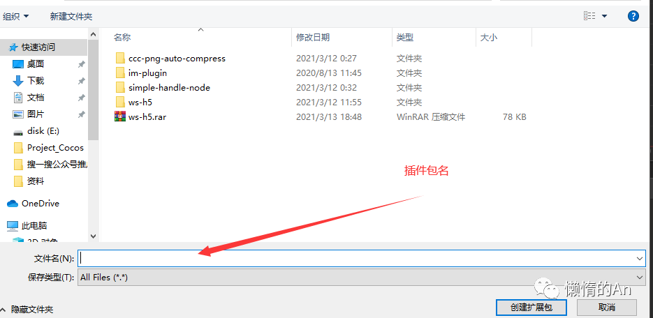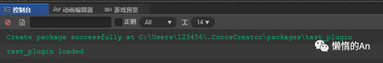 在弹出窗口中输入文件名(插件包名)这里我取名test_plugin,点击创建扩展包;之后再控制台中看到log信息,即表示拓展包创建成功,并成功加载到编辑器