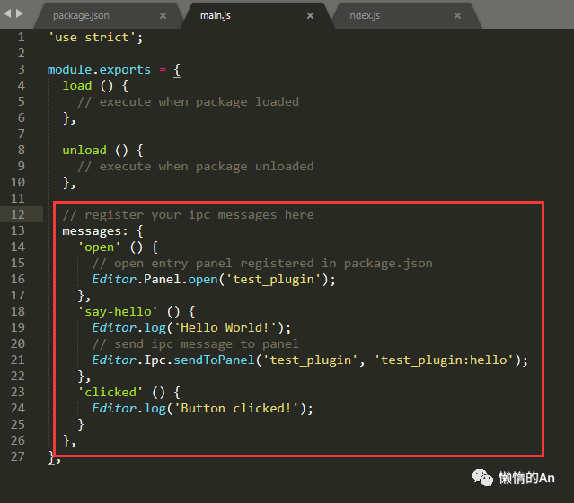 给插件生成了两个扩展菜单open和hello,分别执行了main.js里的两个ipc消息,可以认为是两个方法,打开main.js入口程序查看一下ipc消息的内容: