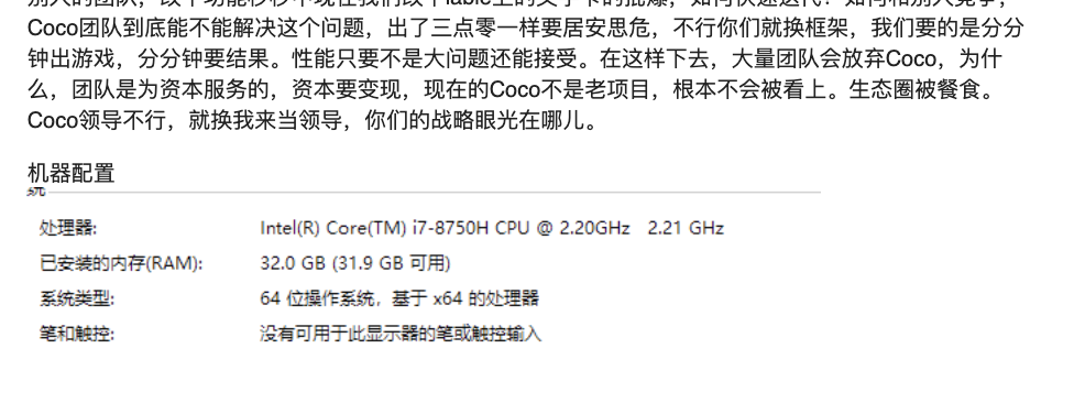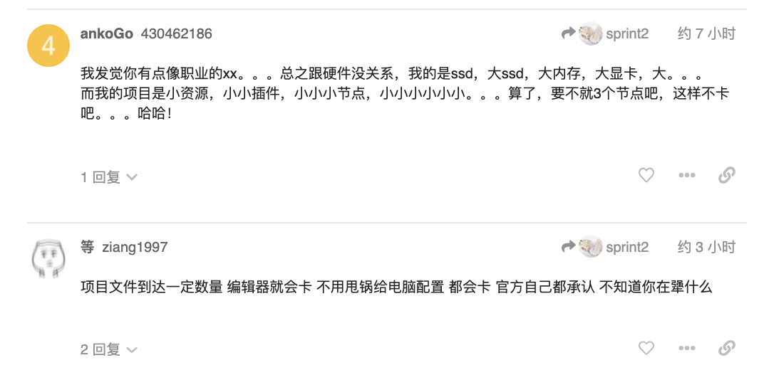 那个帖子已被锁了,只能发在这里了,creator本身就是很卡,我的机器是Mac mini 2018款,全PCI-e ssd,creator2.1.3,图片文件有两三千个吧,编辑动画一卡好几秒,切换窗口会来,转圈至少要五六秒,我们没啥代码,主要是导出UI给cocos2dx用,应该不算编译脚步,主要就是资源刷新,改了编辑器源码关掉自动刷新,切回窗口时好点。就是资源面板太卡了,编辑动画也很卡,好几个美术同事都被劝退了,engine我们也改了一些,不好升级了。creator选择基于electron,也是有利有弊,中大型项目谨慎选择 :joy: