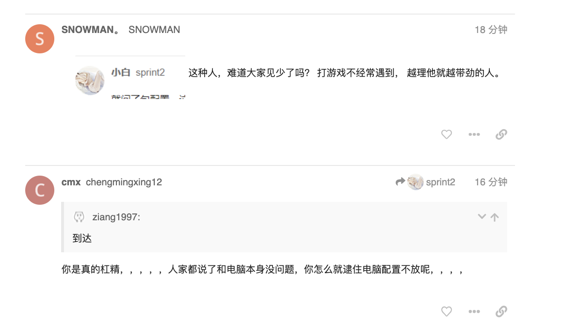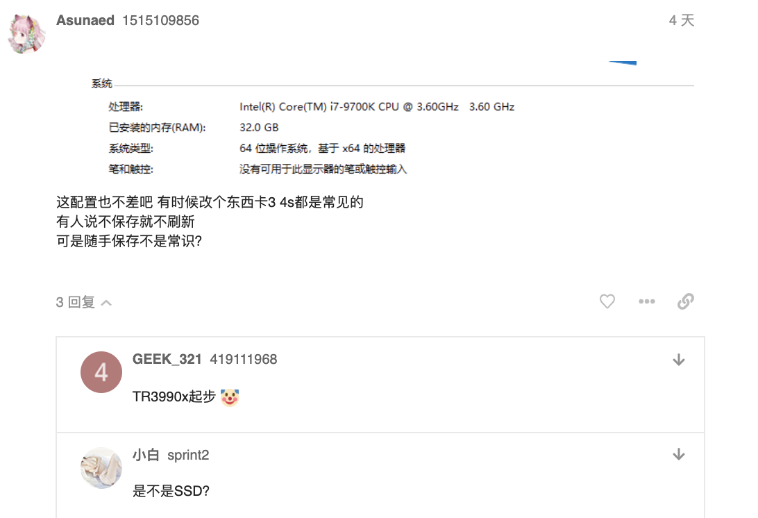 从上到下,提问人发出了配置信息(不带硬盘信息),也没说过跟配置无关,那么问一句是不是SSD排除一下合情合理。也被人怼了,还不让回复了,冤得很呐。更早的回复也有人提出可能硬盘是原因之一,那么SSD自然在讨论范围,这就被喷甩锅了。我先被怼了,还有人喷我?:joy: 有些用户可能是在996那个帖子里不服气,欢迎去那讨论,而不是到处攻击。欢迎官方出引导管管,但不欢迎官方删我贴。:face_with_hand_over_mouth: