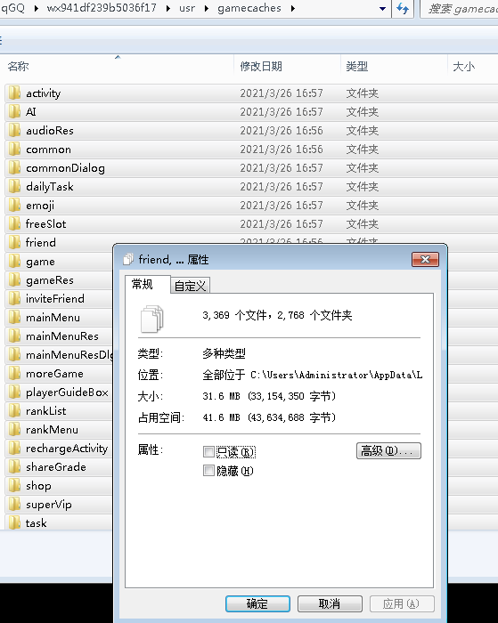 但是就算如此,资源文件夹应该是覆盖的关系,资源包存在gamecaches目录下 42m左右。