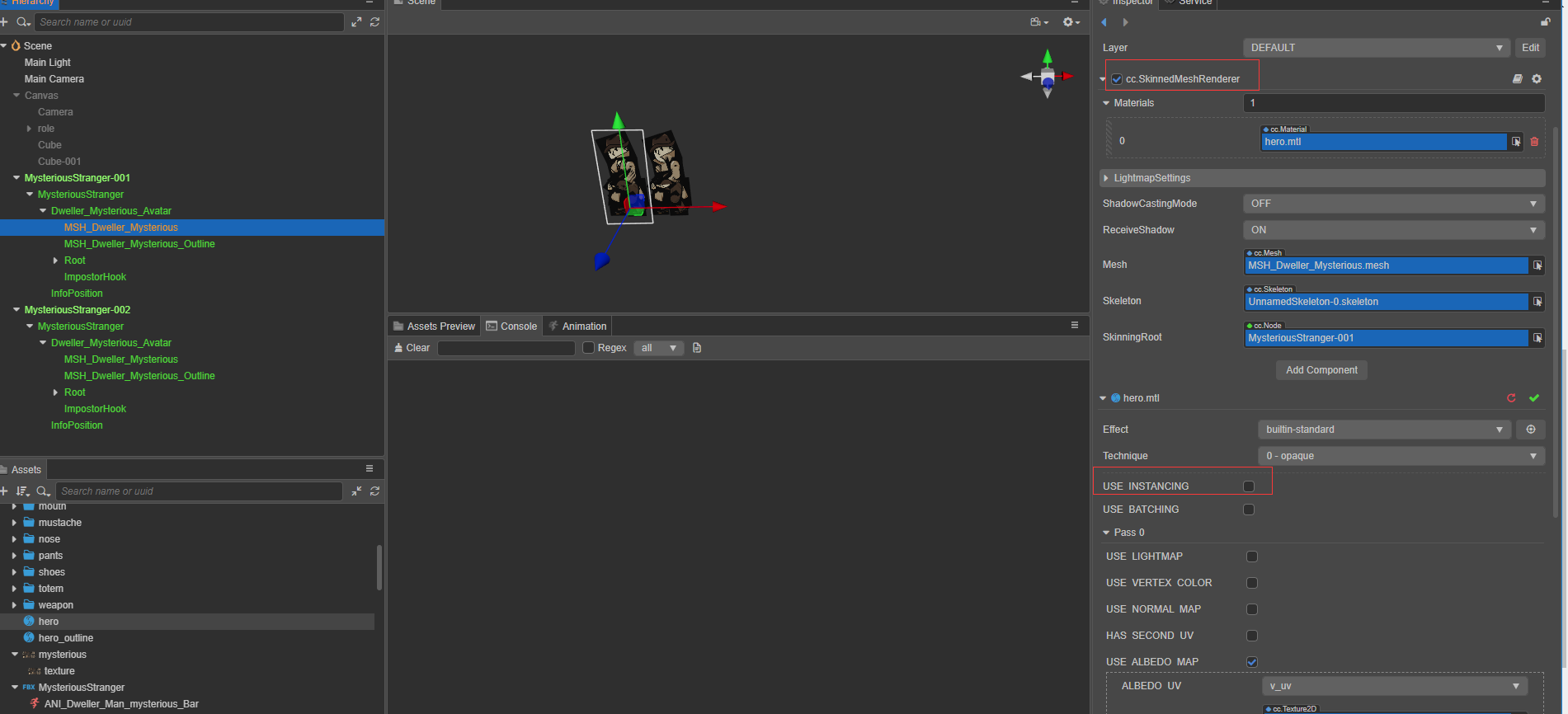 如上图所示,Node和Node-003是一模一样复制的两个skeleton节点,但是渲染出来draw call 会是3个,而不是2个。请问如何实现skeleton的批处理。