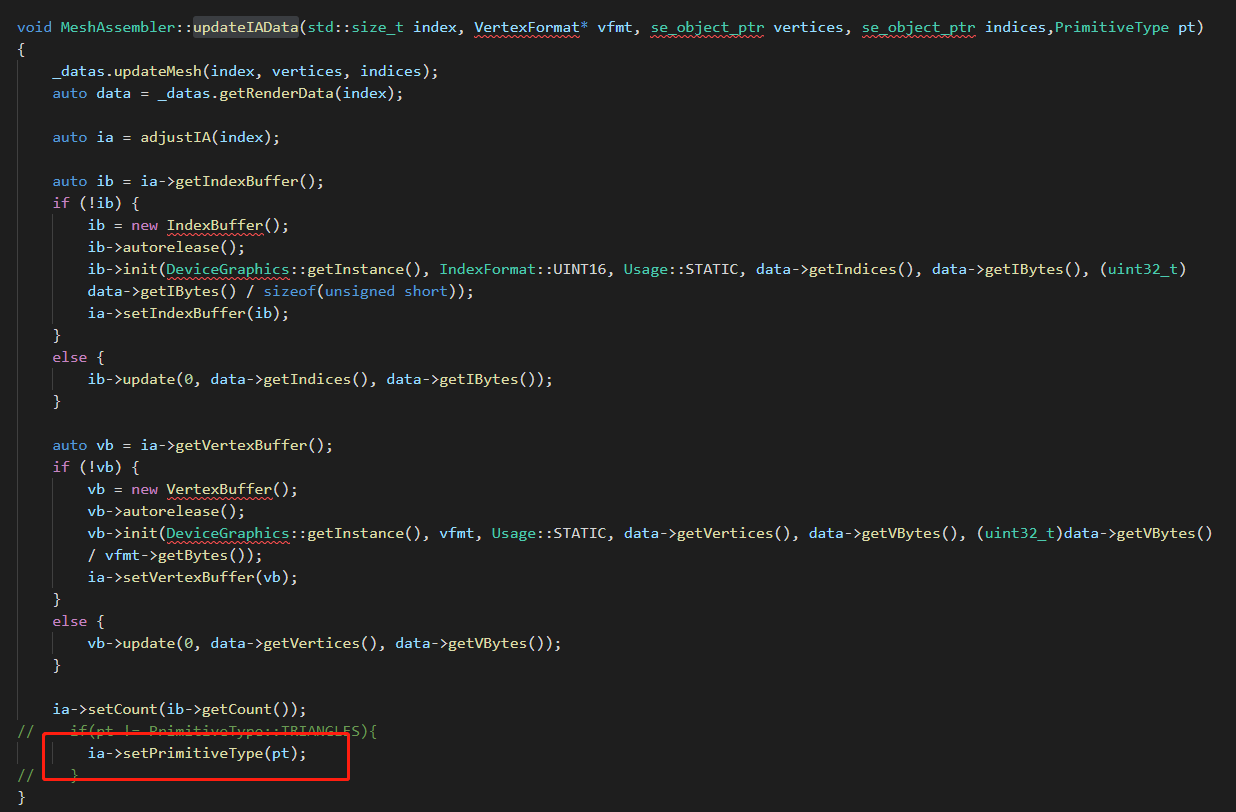 是因为原生渲染mesh写死了用三角形图元渲染的,我是通过自定义引擎弄的,setPrimitiveType设置了保存图元,然后渲染的时候传过去原生那设置的