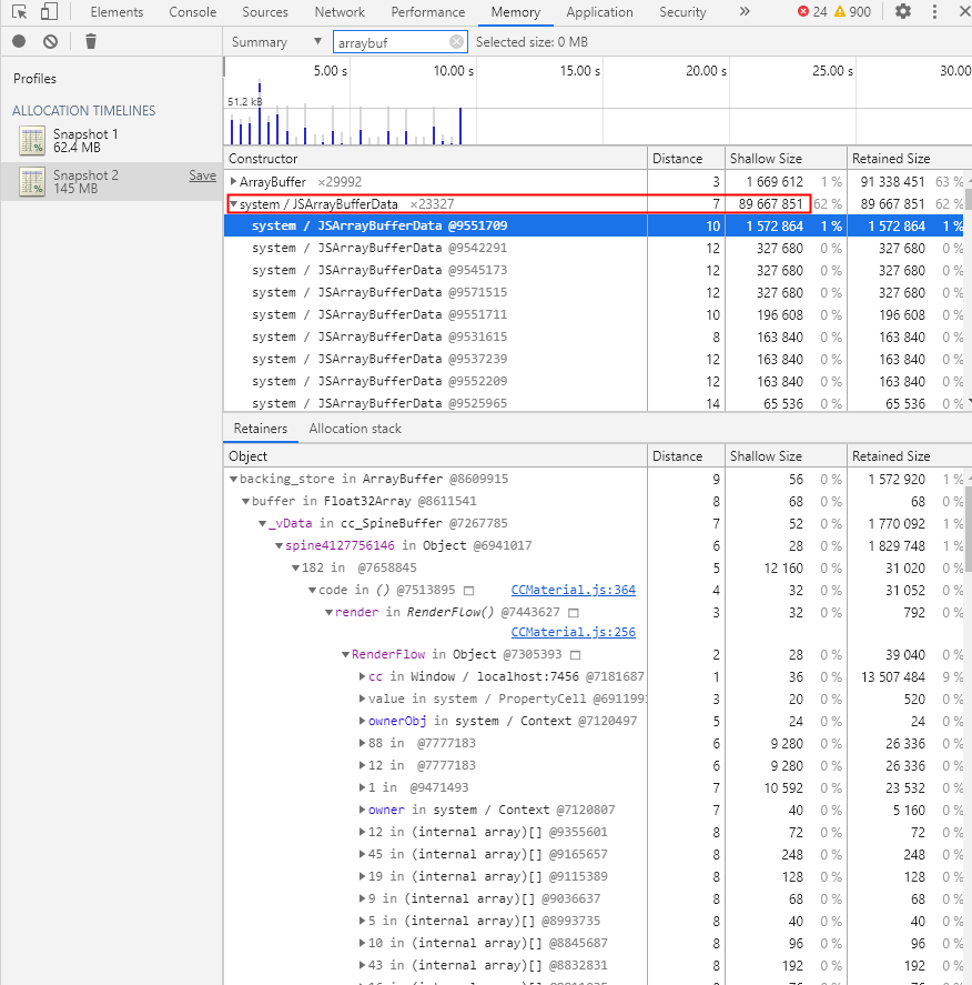 这个 system/JSArrayBufferData 是个啥东西呢?太tm占内存了,游戏过程中持续的增长,我怀疑是消息数据,但是又没证据。 点开里面的内容也是一脸懵逼