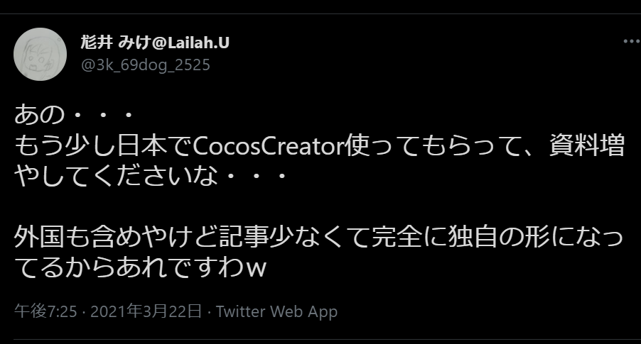 ·Cocos官方账户肯定不是讨论问题的地方,如果能有在cocos推特账户上去回复某些个人利用者的问题, 还不如建立一个日语官方论坛,毕竟现在只有中文和英文的,实在不方便,希望大佬英明决策,谢谢!