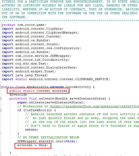 在项目目录下的native\engine\android\app\src\com\cocos\game\AppActivity.java加入了如下代码: