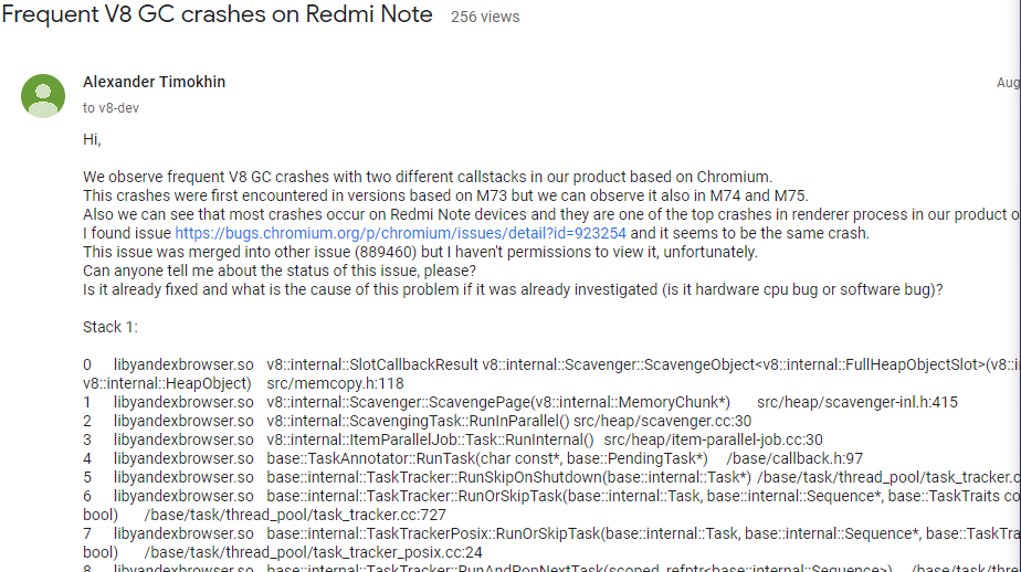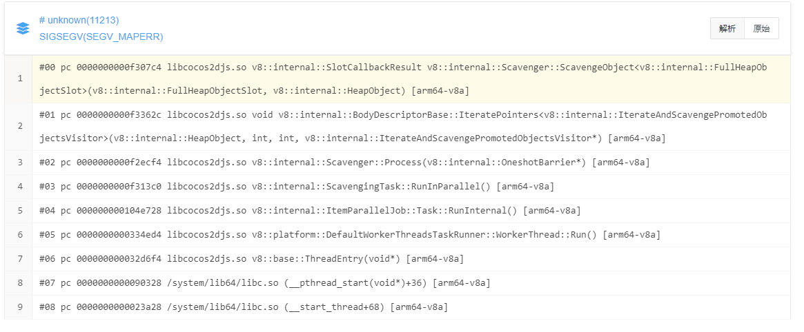 1 #00 pc 0000000000f307c4 libcocos2djs.so v8::internal::SlotCallbackResult v8::internal::Scavenger::ScavengeObjectv8::internal::FullHeapObjectSlot(v8::internal::FullHeapObjectSlot, v8::internal::HeapObject) [arm64-v8a]