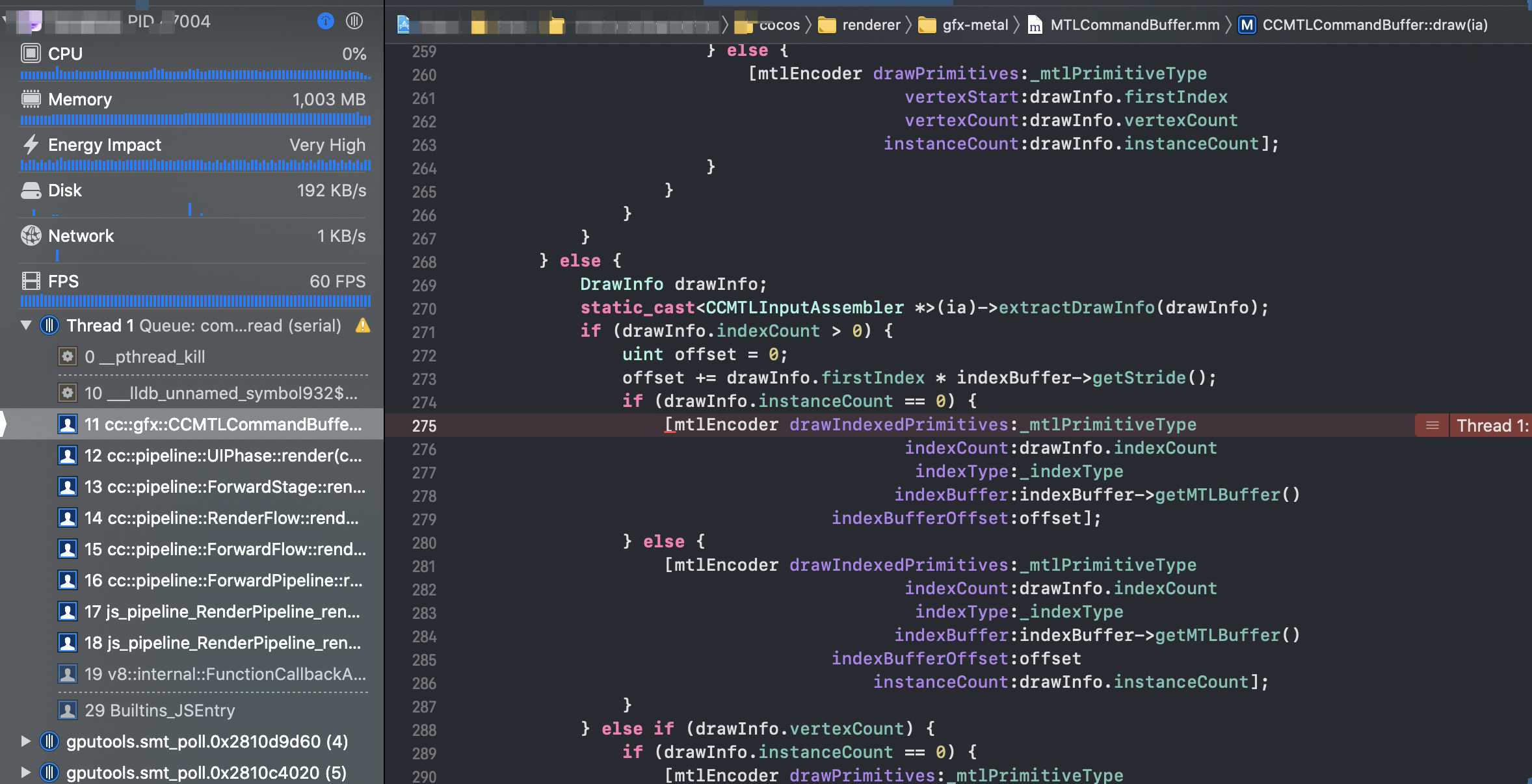 * frame #11: 0x00000001060d9624 `cc::gfx::CCMTLCommandBuffer::draw(this=0x000000011c0ff130, ia=0x0000000283ef7c80) at MTLCommandBuffer.mm:275:21