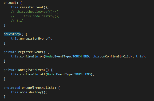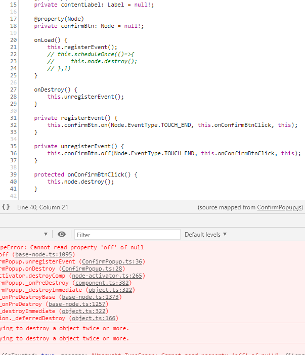 如图confirmBtn是个按钮,点击按钮注销这个节点,节点注销后会注销按钮的TOUCH_END事件,然后就报错了,只要不注销事件就没有问题