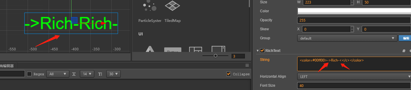 它这个转义<>之后不能立即跟颜色标签this.richText.string = '<color=#00ff00>-\>Rich-\></color>'后面的>不能显示但是这样就可以this.richText.string = '<color=#00ff00>-\>Rich-\>1</color>'