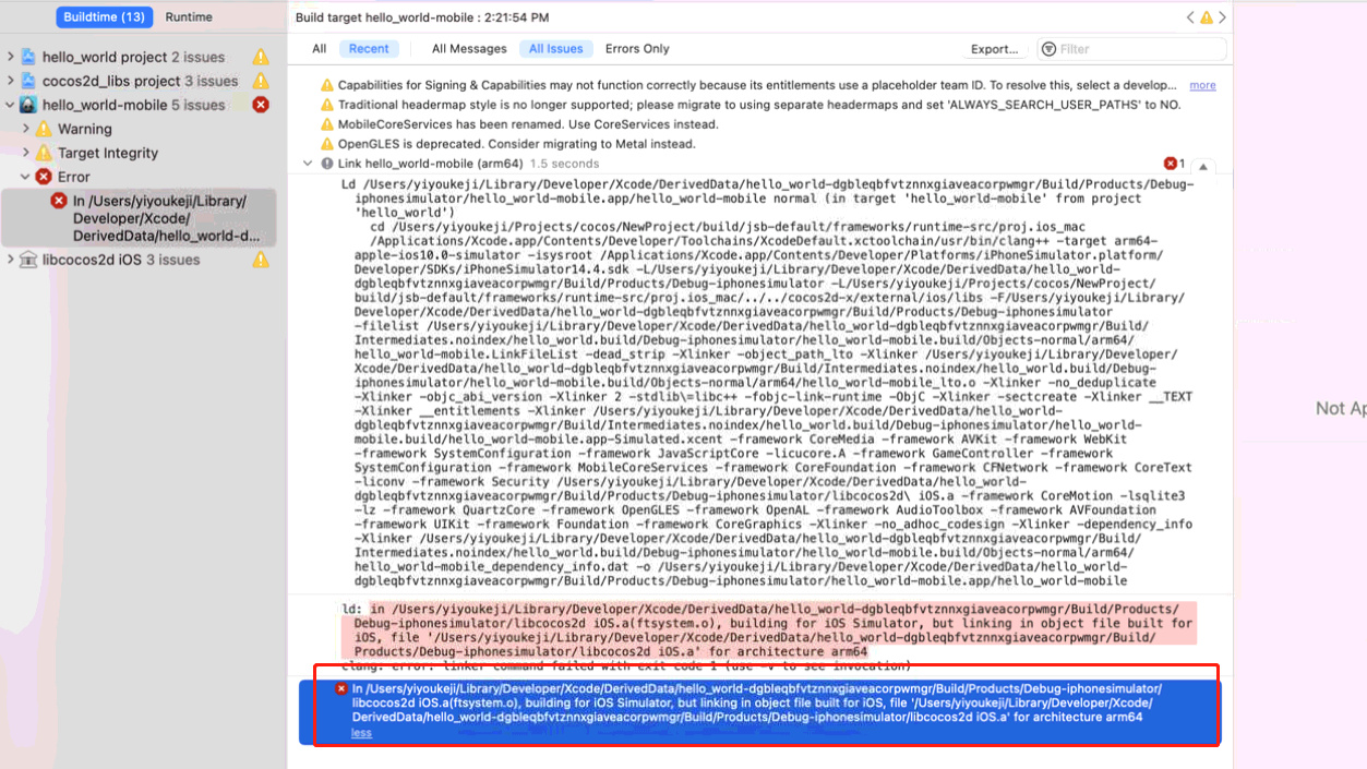 重现方式:新建一个hello world,构建,xcode导入,运行