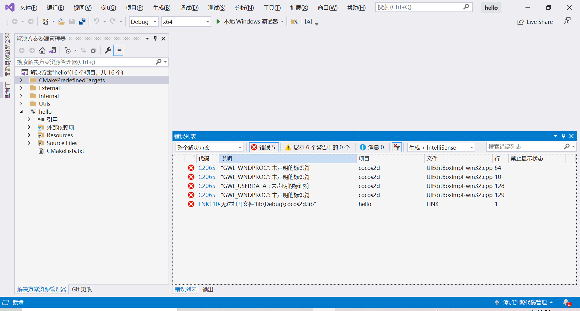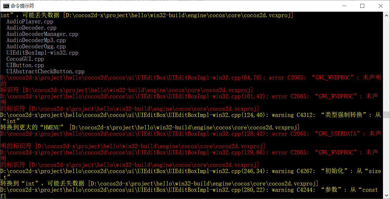 因为cocos2dx报错,编译不出来对应的lib和dll文件啊,找不到对应的lib文件,自然就报链接错误。上面那四个错误,改起来很简单的,百度一下就知道了,好像是GWL_WNDPROC改成GWLP_WNDPROC吧。