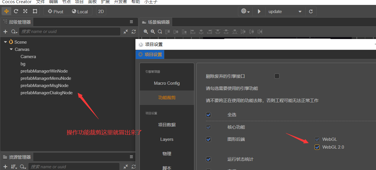 当调试的时候,在脚本里动态对当前场景添加了几个节点,当时编辑器里不会有问题,但是点击顶部菜单的项目->项目设置->功能裁剪->勾选/取消勾选WebGL2.0 就会突然把动态添加的节点加到编辑器的场景文件里.