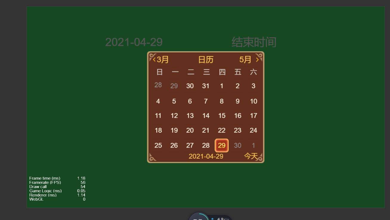 日历插件2是一个完全独立模块直接导出任意项目就能用 适用于任意版本,在版本1 的基础上增加了限制时间查询功能,以及其他的优化,这里就不多说了,直接用就行了。这里可能有小伙伴会 问, 怎么占用 这么多的draw call , 其实还好,如果真的还想优化,就用 font 咯 !!!! 下个帖子直接出 cc.ScrollView 的优化,希望大家多多支持。calendar.zip (635.2 KB)