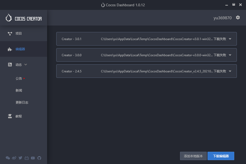 暂时单独下载编辑器,然后在dashboard里面添加本地编辑器