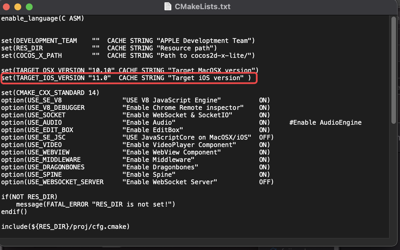 1.找到工程目录/native/engine/common 下的CMakeLists.txt 修改set(TARGET_IOS_VERSION “11.0” CACHE STRING “Target iOS version” )。