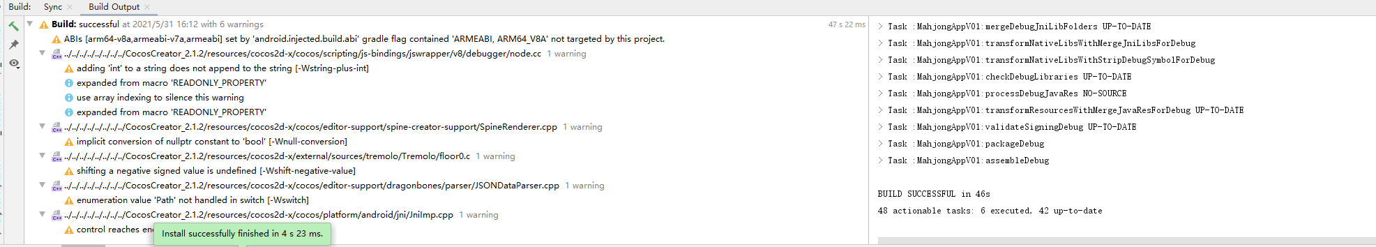 Projects loaded. Root project using build file ‘D:\Work\Coscos2dProject\MahjongAppV01\build\jsb-link\frameworks\runtime-src\proj.android-studio\build.gradle’.