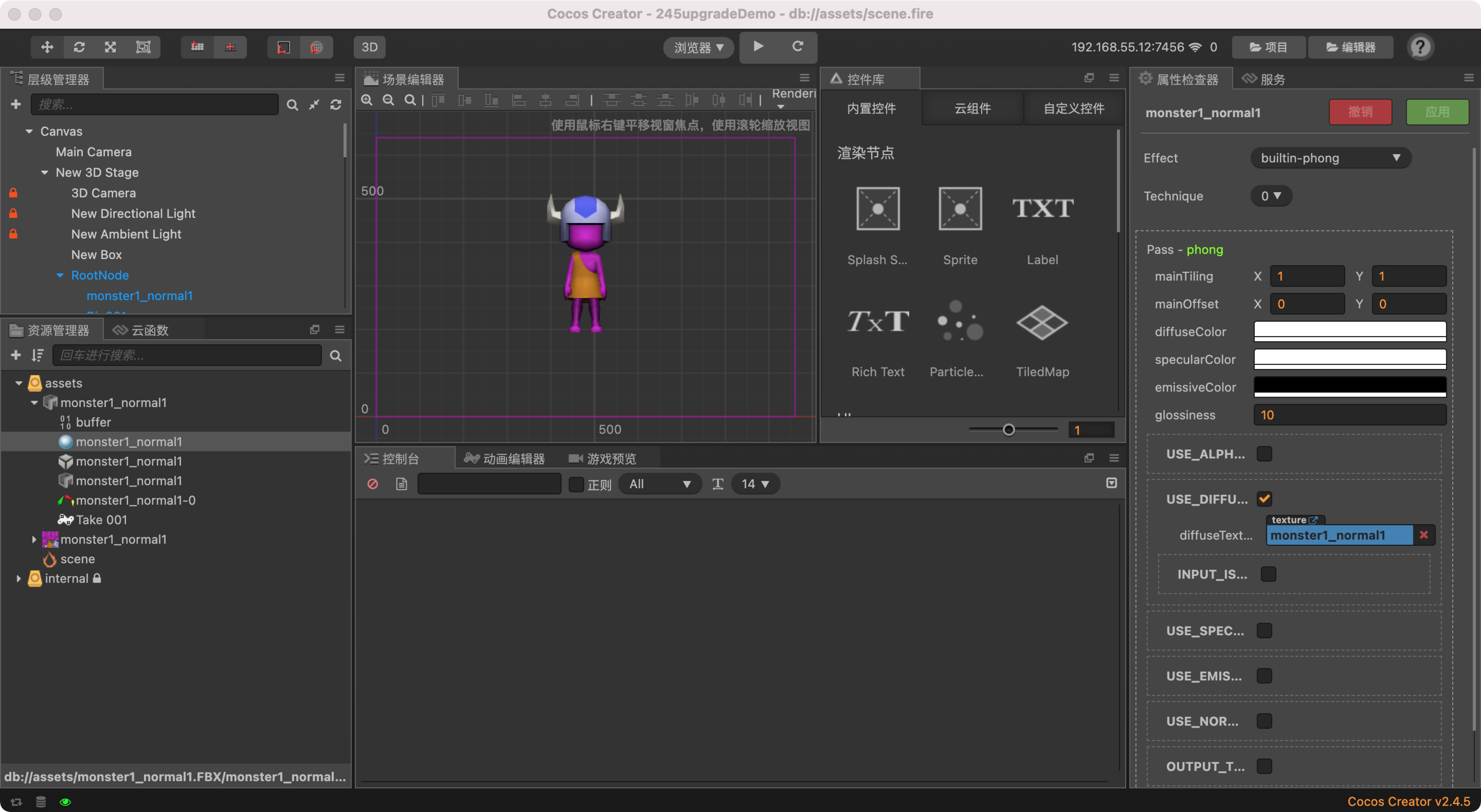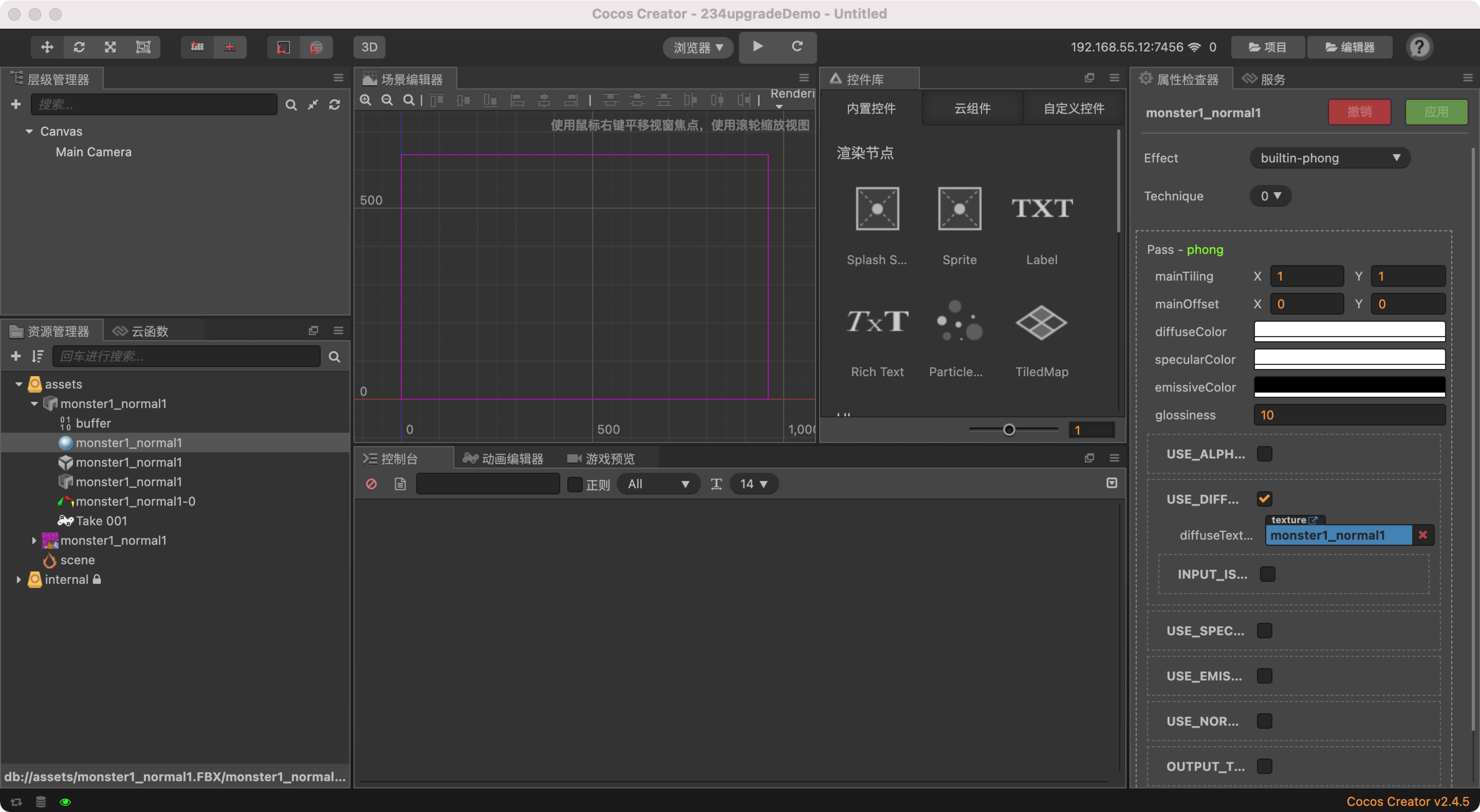 这个工程,2.3.4 升级到 2.4.5 模型材质纹理是哪个没了?我这边升级前后没看出模型出现什么纹理异常。你说设置材质纹理报错?错误是什么,具体操作是怎么样的,可以录制个视频看看。
