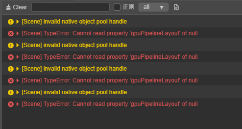 复现方法:使用VScode编辑shader过程中,会经常的编辑-保存-回引擎看效果,而当在引擎中选中正在使用该shader的材质时,这时编辑并保存shader回到引擎时,偶尔会报错:cannot read property ‘gpuPipelineLayout’ of null。
