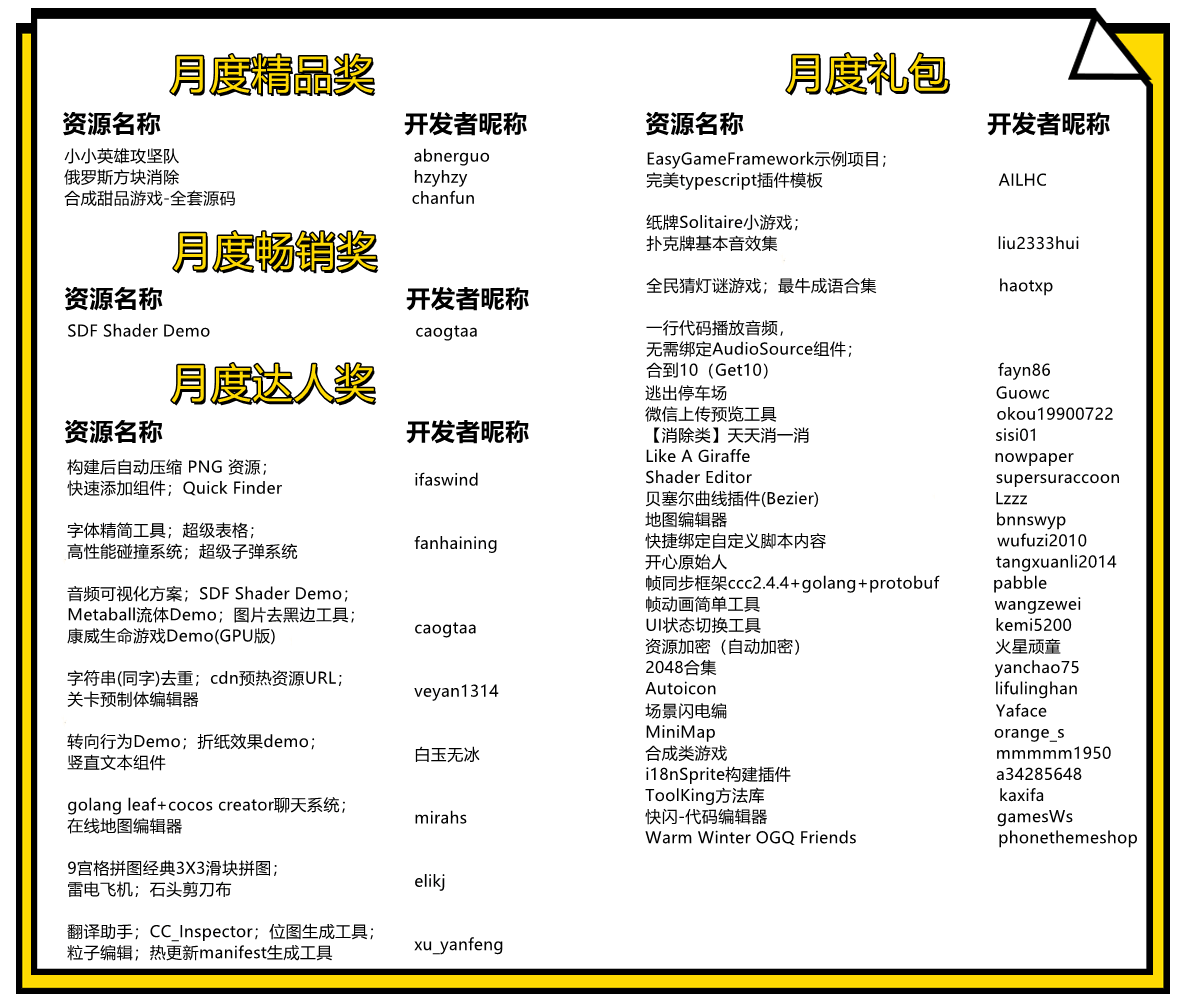 本次挑战赛,来自五湖四海的 Cocos 开发者用扎实的技术知识和丰富的想象力,创作出丰富多样的作品,为 Cocos Store 增添了许多宝贵资源。我们从中评选出 月度精品、月度畅销、月度达人、月度 礼包 四个奖项,为获奖者送上精心准备的小礼物!