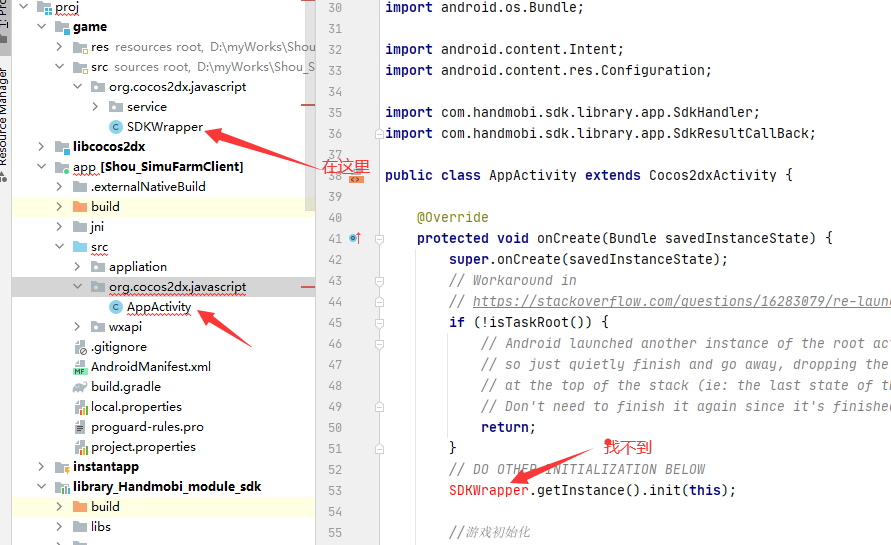 求问我用cocosCreator 2.4.4的安卓构建打包,由于要接入第三方SDK, 用Android Studio 4.2.1打开\jsb-link\frameworks\runtime-src\proj.android-studio的android工程,在还没有接入任何第三方sdk的原始工程情况下然后在AppActivity.java下就报SDKWrapper红字找不到错误,如下图