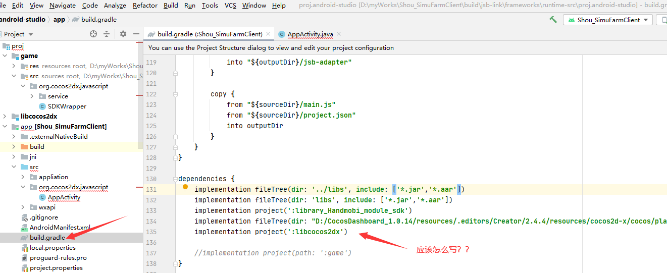 如图那文件就在game下的src的org.cocos2dx.javascript下,可为什么找不到呢,生成打包是可以生成成功,就但是那红字报错很不爽,我知道这种找不到肯定是因为build.gradle的依赖dependencies没写好,可是对新版的android一窍不通的我真是苦手呀 查遍整个百度花费几天时间都没有查到怎么写这个依赖关系的,求问大神怎么写这个dependencies才能让它不报错,谢谢各位大神了。