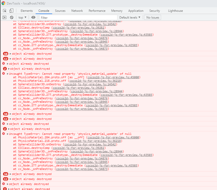 首个报错:首个报错为 Uncaught TypeError: Cannot read property ‘physics_material_update’ of null