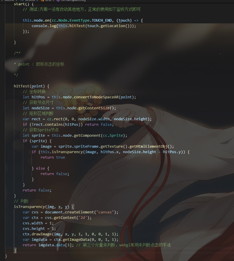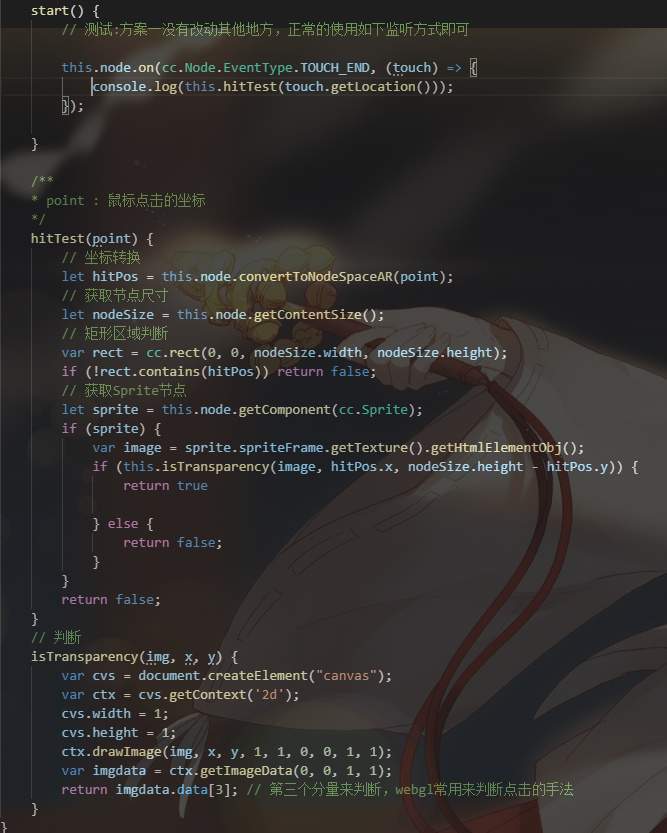 像素的方法,第一个是getHtmlElemntObj这块,getTexture自动合图和不合图应该是有区别的,貌似得做一下兼容;第二点就是看起来只是用在web端的。第三点是这个脚本如果是挂载到图片上的,那么就得做一下事件吞噬的处理。要不然事件应该没法传递到下层吧。