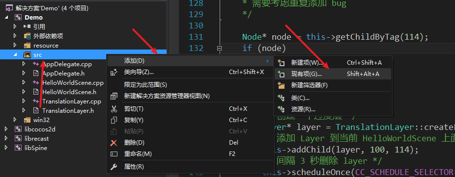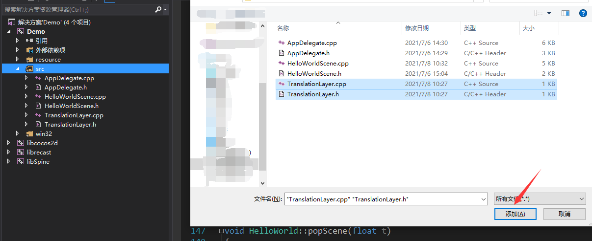 选中 ==》 TranslationLayer.h 和 TranslationLayer.cpp 文件 ==》 点击添加。即可导入到项目。