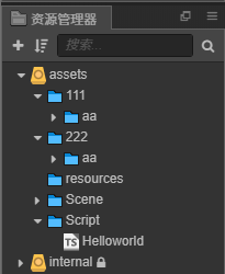 使用Cocos Creator 2.4.4创建hello-world模板项目,在assets目录下创建文件夹111,222,两个文件夹下创建同名子目录aa如下图: