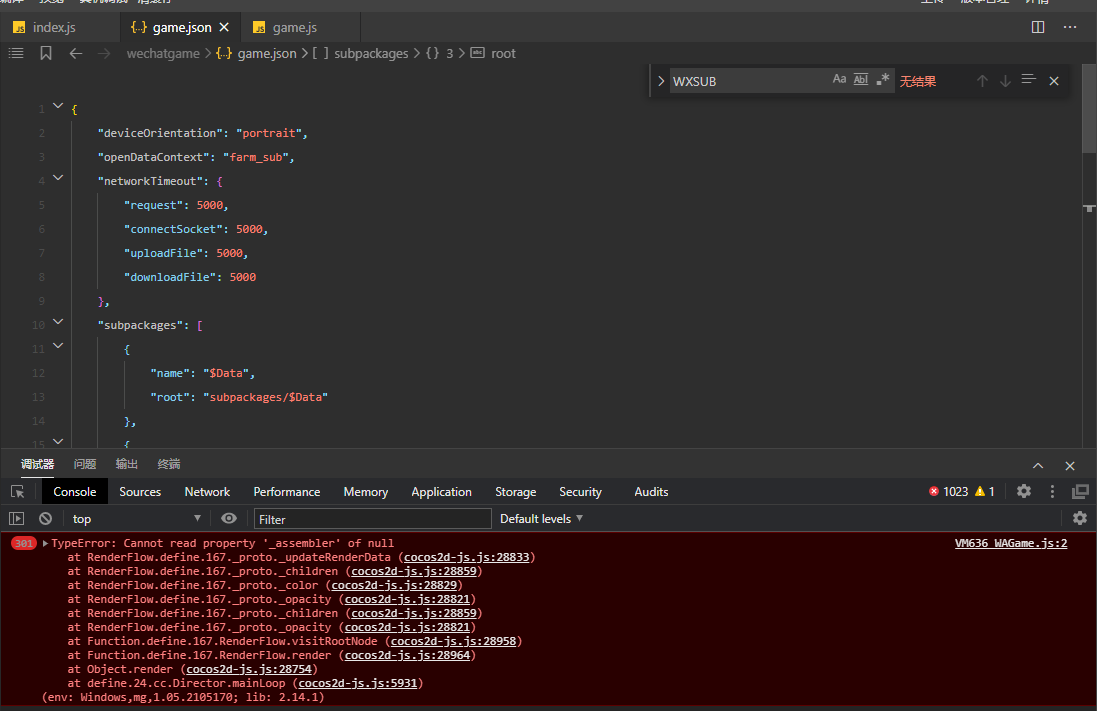 3.‘farm_sub’以非开放域方式build后,在微信小游戏平台单独打开,也不报错。只有当‘farm_sub’以开放域build后接入主域项目时,会出现该错误。