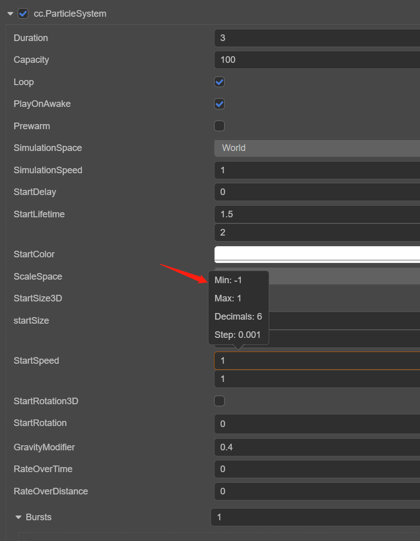这里有好几个限制了-1到1大小的属性,但是,实测发现,你可以正常设置比1大的数值,粒子该属性也会生效,但是编辑器里硬是只显示-1到1,这个bug有点低级啊,而且对开发人员调数据带来贼大的不方便。
